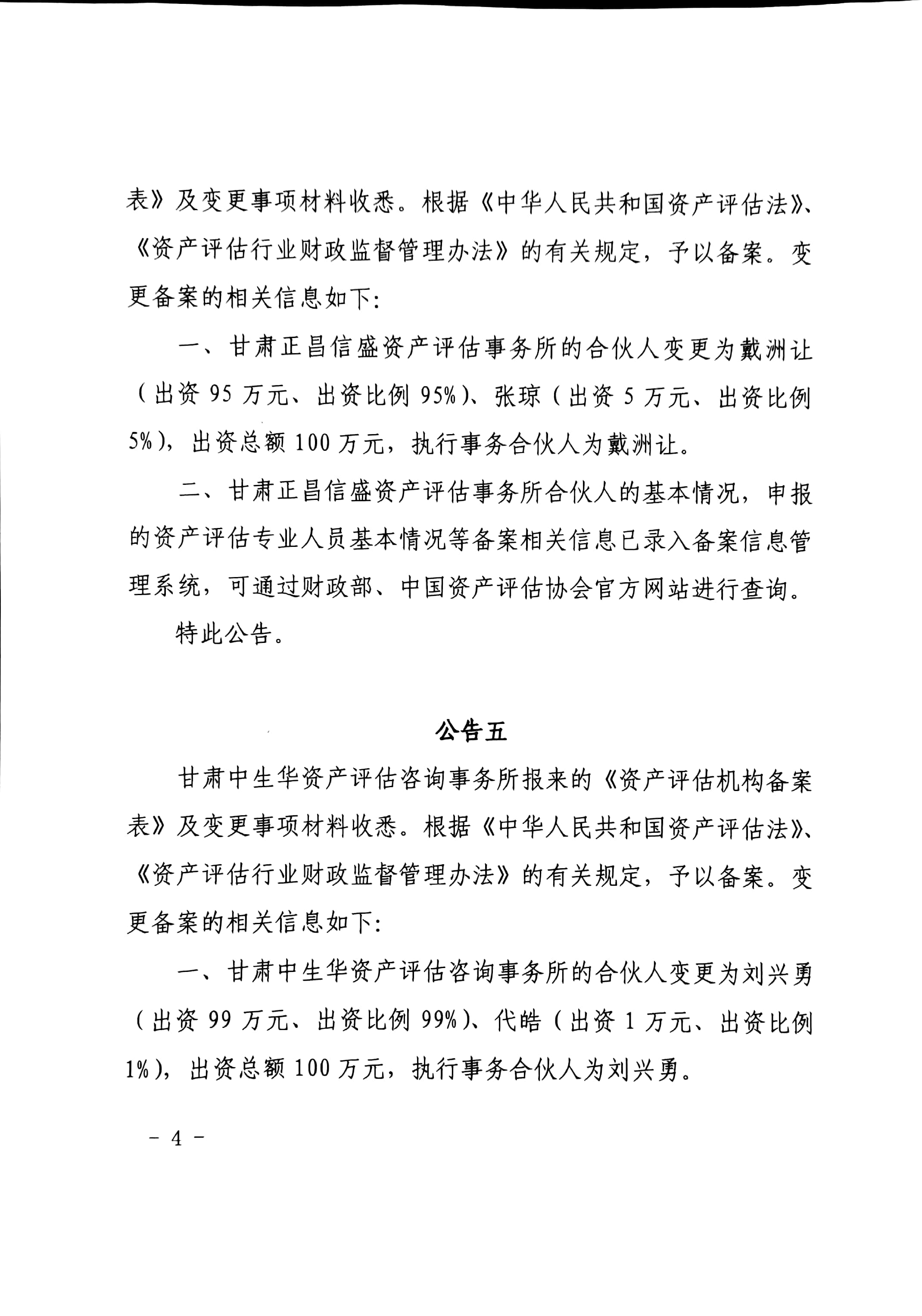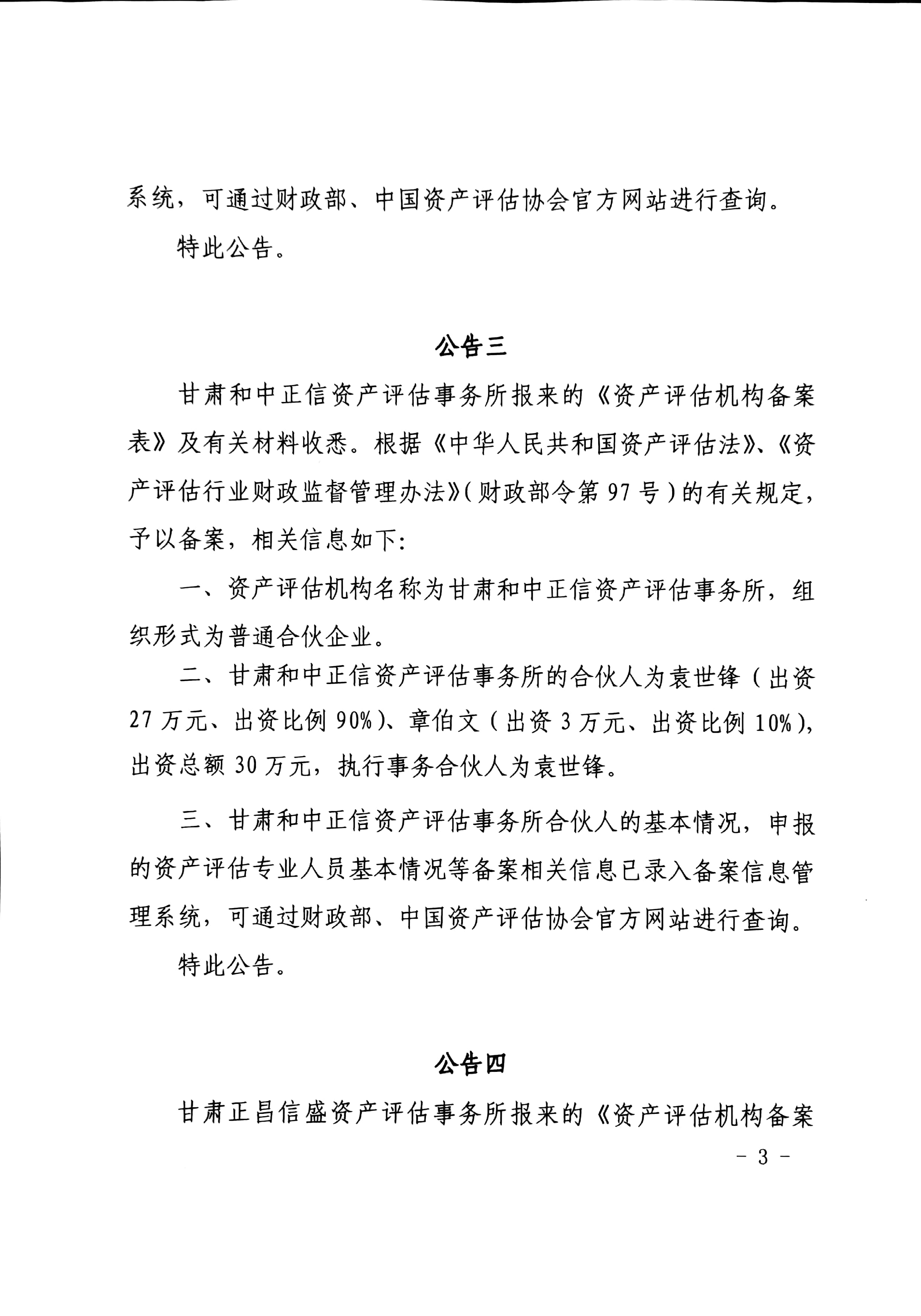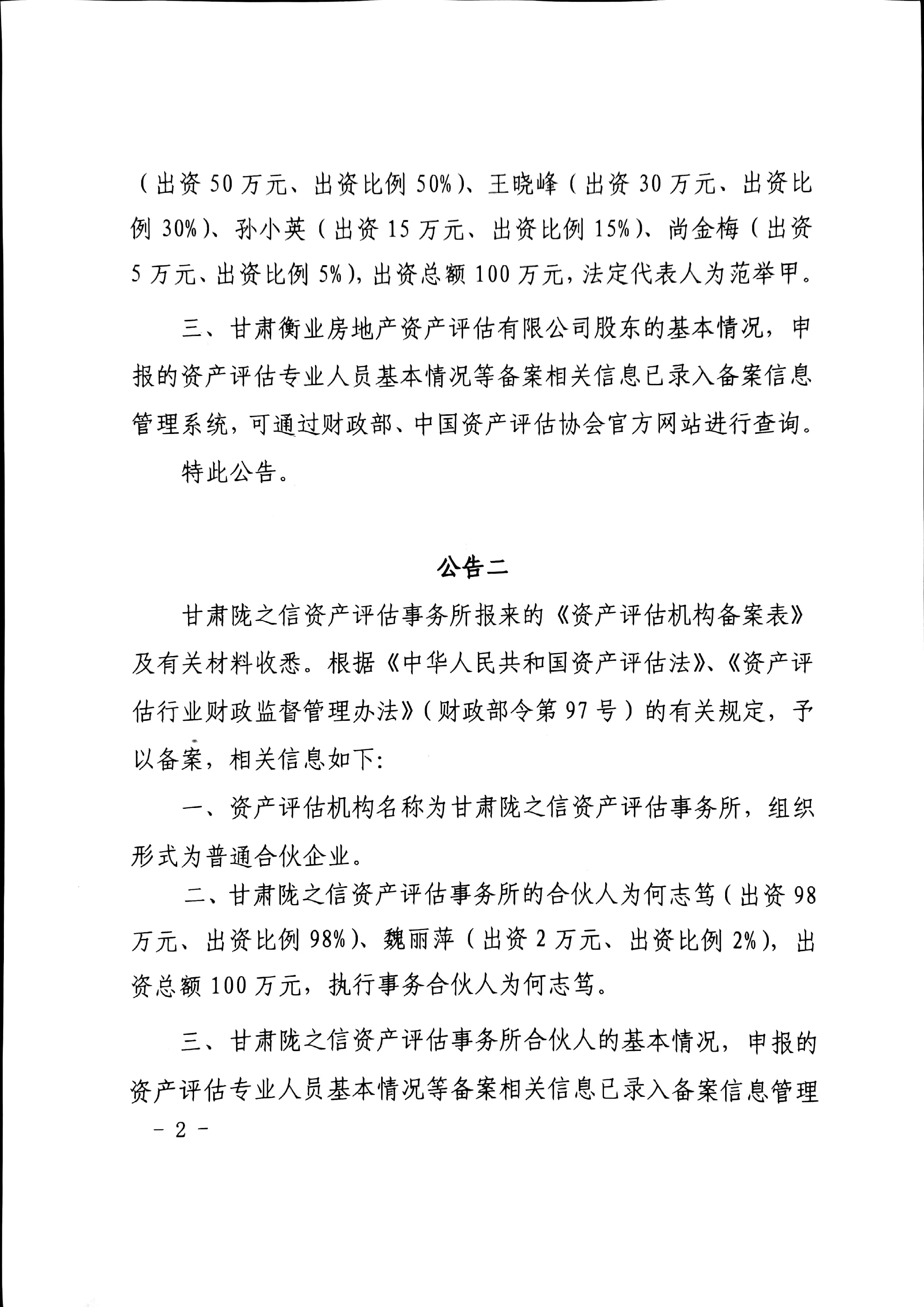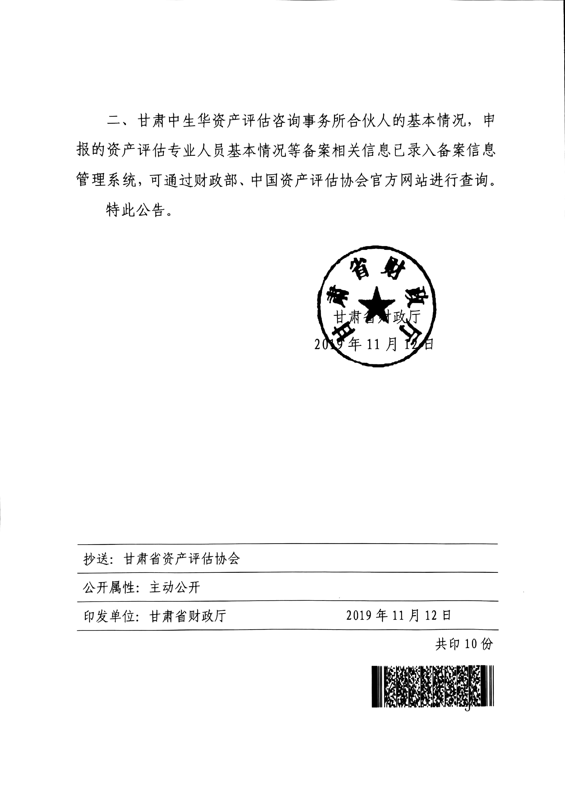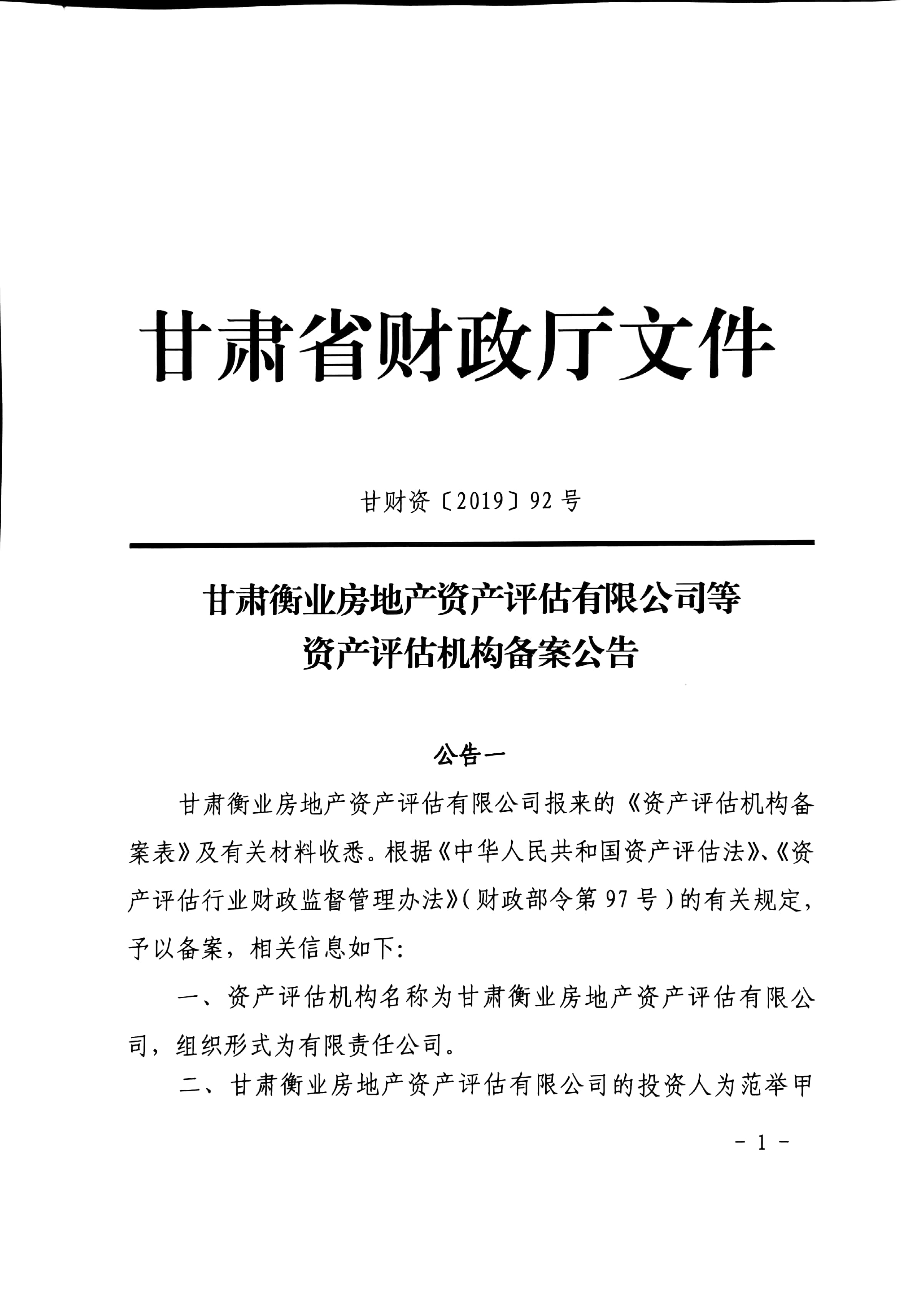 甘财资【2019】92号--甘肃衡业房地产资产评估有限公司等资产评估机构备案公告